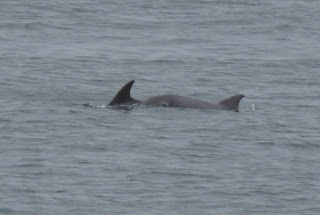 A damp and gloomy day but a message from Curly of an otter off the cow and calves rocks in Fishguard Bay off the outer breakwater this morning cheered me up. Although the Otter had gone by the time I got there Curly was still there to point out that the dolphins had arrived. It was murky with poor light but I managed a few shots and proof that Apache and Ringo are still in residence.